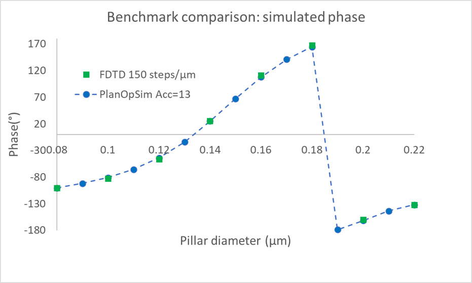 This benchmark demonstrates that both the PlanOpSim software and FDTD are equally accurate solvers for metasurface design, however the RCWA method is much faster in reaching these results.