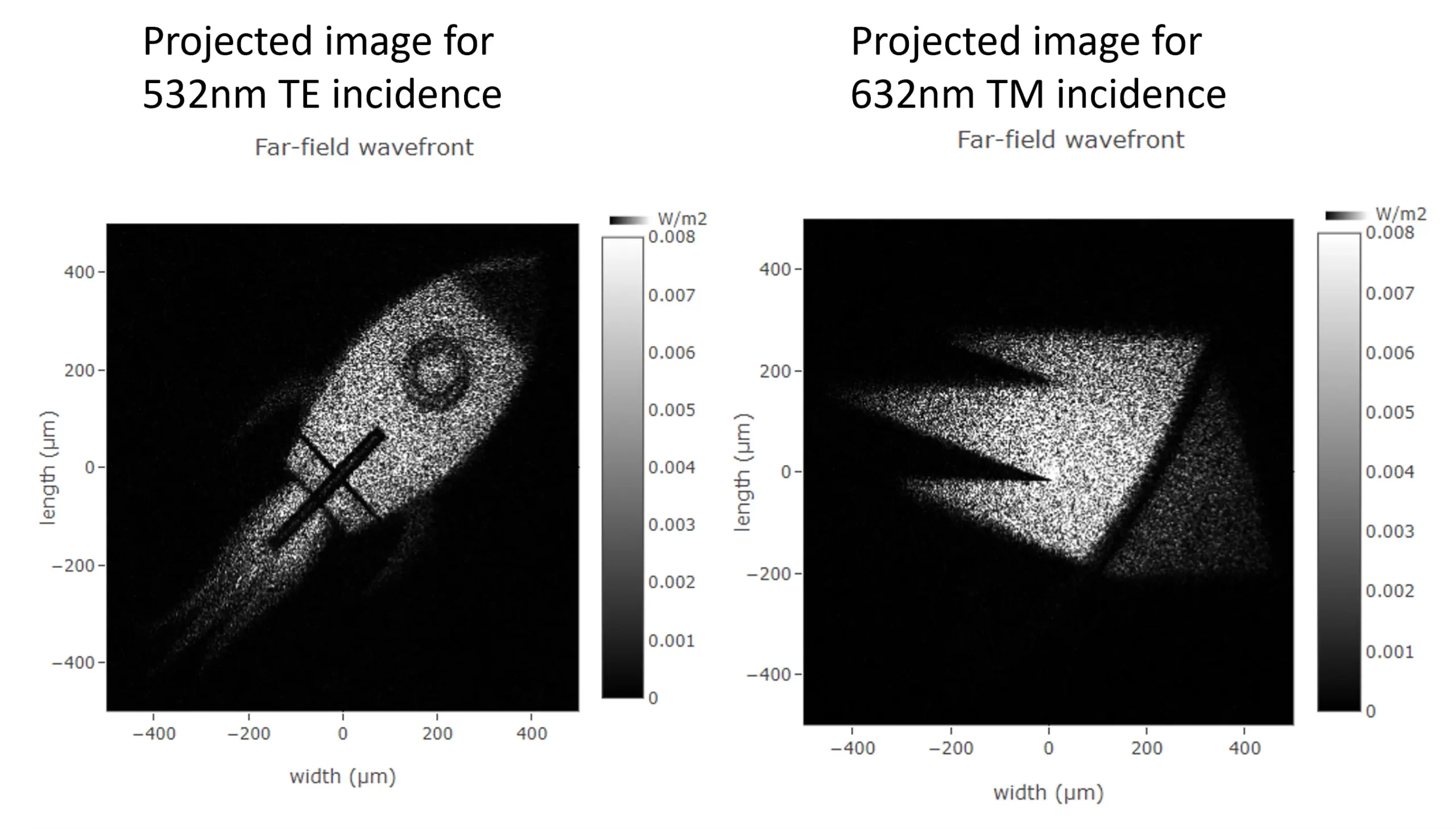 To verify the designed metasurface we simulate the projected image at the design distance of 1.37mm and opening angle of 20°. Figure 6 shows the simulated intensity for 532nm and 632 nm respectively. The projected images reproduce the target. The projected image does have a noticeable speckle noise. This is a typical phenomenon for phase-only holograms. The calculated transmission is respectively 68% and 90% for 532 and 632nm, 43% and 64% of the incident light are within the target illumination area.
