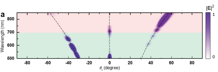 Apart from beamshaping purposes, metasurfaces also offer new possibilities for beam steering. Splitting a spectrum across a wide angular range with high efficiency usually requires multiple components. In the metagrating below[9], the spectrum was split over a range larger than ±40°. The metagrating acts as a blazed grating diffracting to positive angles for wavelengths over 700nm while wavelengths below 700nm are diffracted into the opposite direction. Effectively acting as if the component was rotated for those wavelengths.