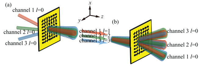 Another case of combining multiple functions in one metasurface is this multiplexing component. This metasurface was designed to simultaneously multiplex/de-multiplex different channels separated by both orbital angular momentum and wavelength[8].