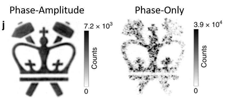 The images below shows two experimentally recorded images left is a PA hologram which produces a better defined image, the right side image, whioch is made using the phase-only approach, is more intense (the scale bar is about 5 times higher) but the image suffers from speckle noise[5].